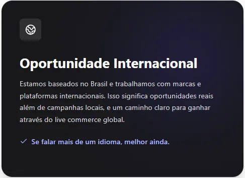 Para pessoas que querem trabalhar com live commerce de forma profissional. É ideal para quem se comunica bem, tem presença de câmera e quer crescer em vendas ao vivo.